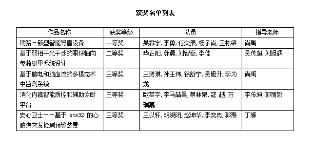 本次竞赛以“创新驱动,健康未来”为主题,旨在展示生物医学工程学科领域内贴近临床、服务健康的创新设计。共有来自全国250所高校的近1万名选手组成3000多个项目参赛。我院师生精心组织筹划、用心打磨作品,经过严格的竞赛评分,最终共有5支参赛队伍获奖,分别获得全国一等奖1项、二等奖1项、三等奖3项。