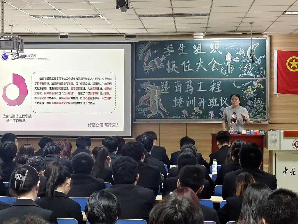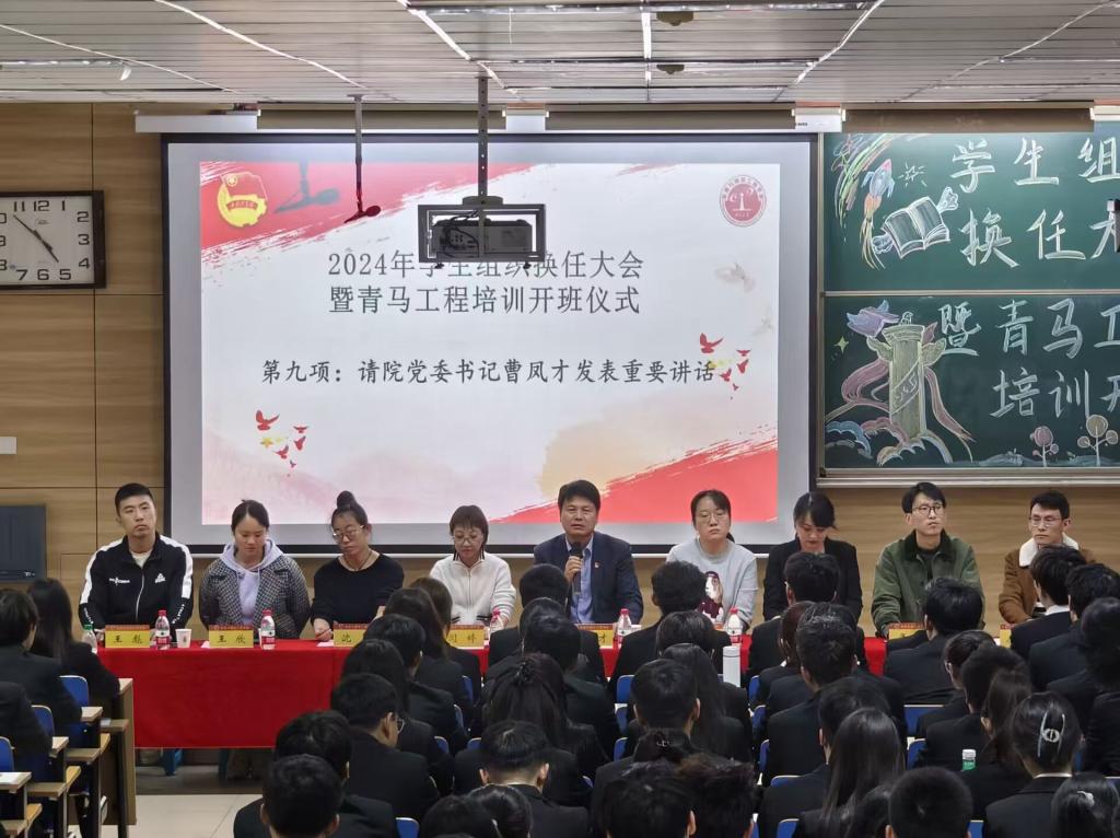 10月29日下午,必赢线路检测中心2024年度学生组织换任大会暨青马工程培训开班仪式在09202H教室成功举办。学院党委书记曹凤才、党委副书记兼副院长魏媛媛、团委书记闫婷、学生科张永玲老师、沈晨老师、孟伟老师、王欣老师、左冠华老师及本科生、研究生全体学生骨干及青马学员出席大会。会议由院团委王彪老师主持。