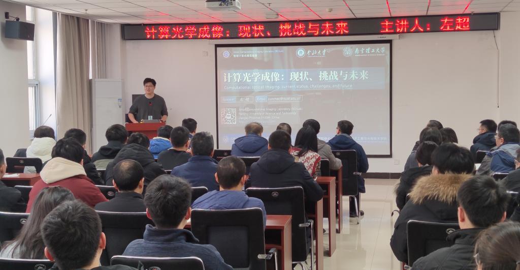 在报告中,左超教授首先为大家介绍了“计算光学成像”这一新兴交叉研究领域的基本概念,重点将前端物理域的光学调控与后端数字域的信息处理有机结合,为突破传统成像技术的诸多限制性因素提供了新思路;然后介绍了南京理工大学智能计算成像实验室在此领域的最新研究进展,并展望其未来发展方向及其核心赋能技术—人工智能与深度学习;最后,在座师生与左超教授针对相关学术问题进行了深入的探讨和交流。