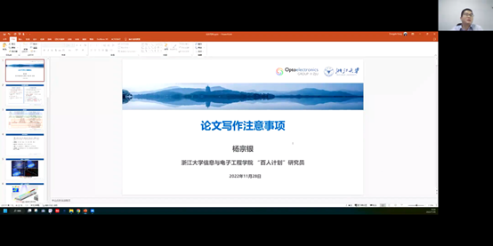 为提高光学工程学科师生的科技论文写作能力,光学工程学科于2022年11月28日上午采取线上会议的方式,特邀浙江大学杨宗银研究员以科技论文写作和发表为主题开展了学术交流,本专业广大青年教师、博士和硕士研究生积极参加了此次活动。