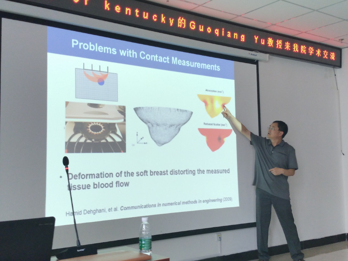 2018720上午9点,美国肯塔基大学终身教授、国际著名的生物医学工程专家Guoqiang Yu应中北大学生物医学成像与影像大数据山西省重点实验室的邀请,来我院进行了学术交流,并在学院715学术报告厅做了非接触式近红外漫射光散斑组织血流成像技术学术报告